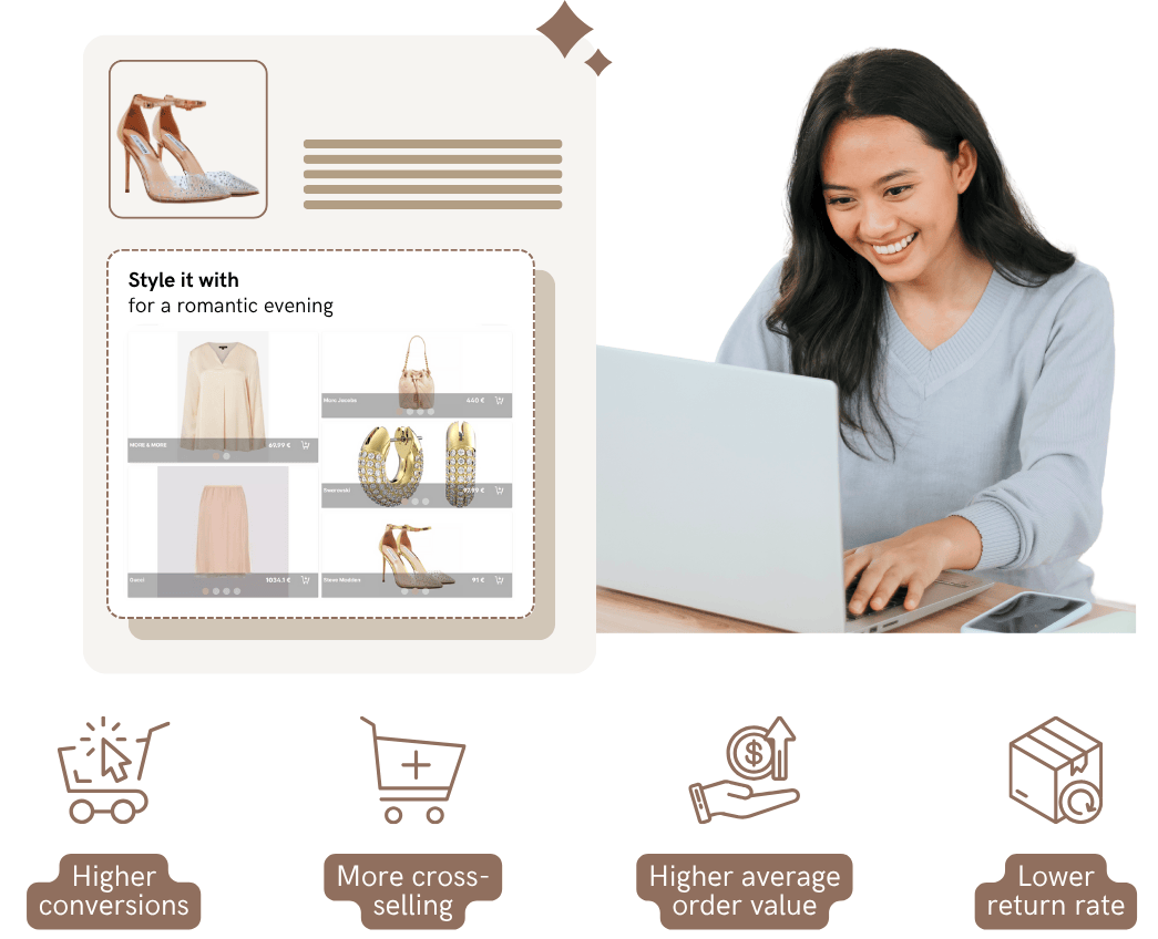 Intelligent styling suggestions that help customers visualize complete outfits. AI generates contextual recommendations based on occasion, style preferences, and current trends.